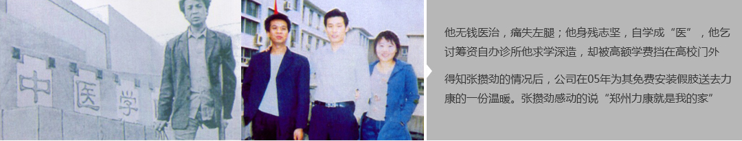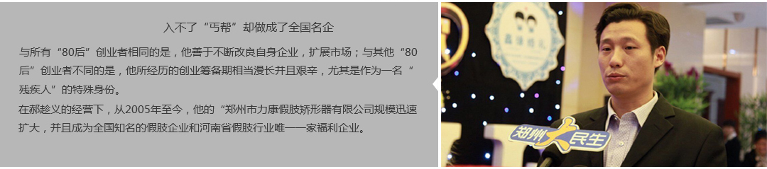 鄭州市力康假肢矯形器有限公司(簡(jiǎn)稱(chēng)力康),是一家專(zhuān)業(yè)從事假肢矯形器的設(shè)計(jì)、研發(fā)、制作及裝 配的專(zhuān)業(yè)機(jī)構(gòu)。成立于1992年是河南省唯一一家福利企業(yè)。力康下設(shè)業(yè)務(wù)部、技術(shù)部、住院部、康復(fù) 部、售后服務(wù)部,并配有現(xiàn)代化的裝配車(chē)間和功能齊全的訓(xùn)練大廳,為殘疾朋友康復(fù)訓(xùn)練提供了可靠 保障。總經(jīng)理穿戴假肢多年,有著豐富的臨床經(jīng)驗(yàn)和親身體會(huì);多年來(lái),力康已為全國(guó)幾十萬(wàn)名殘疾 朋友安裝上舒適、美觀、耐用的假肢和矯形器具,使他們更大限度地恢復(fù)了正常的工作和生活。“產(chǎn) 品即人品”的質(zhì)量理念、先進(jìn)的技術(shù)、實(shí)惠的價(jià)格、完善的售后服務(wù)是力康取勝的法寶……